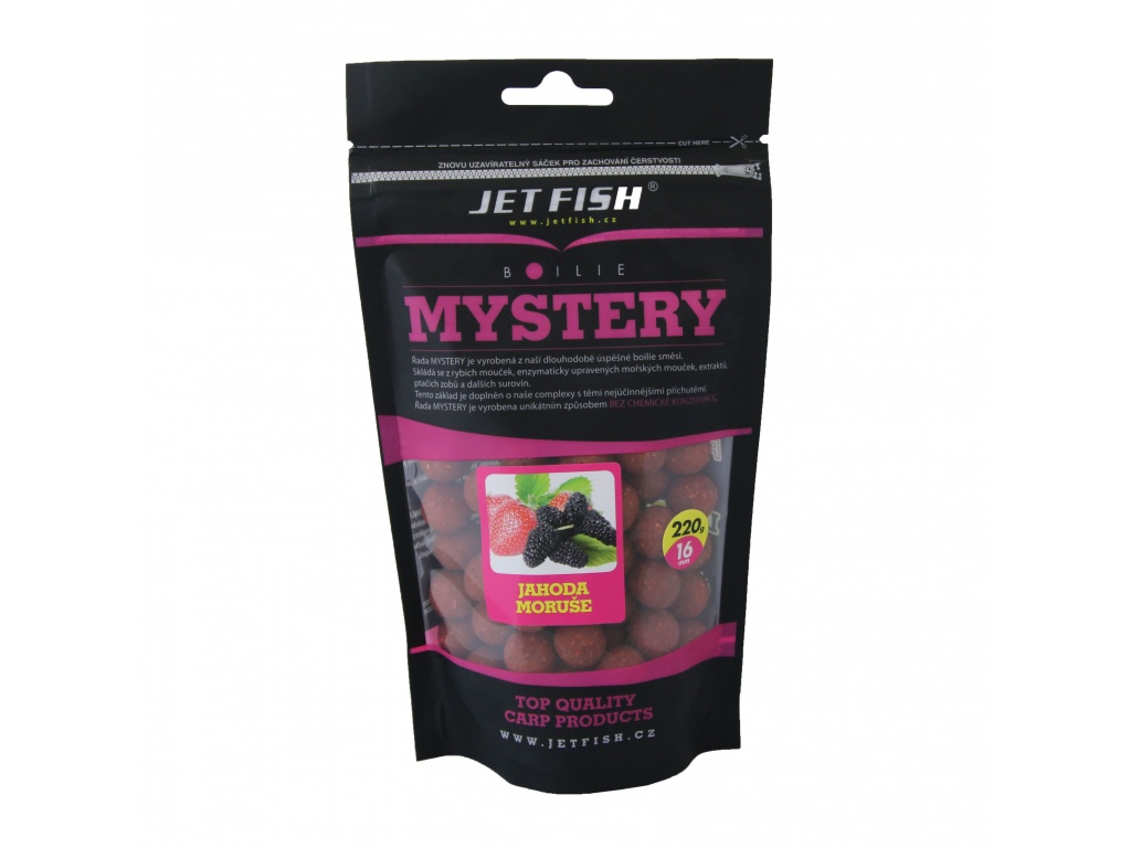 Při sestavování této řady boilie šlo především o vytvoření nejrychleji fungující nástrahy na krátkodobý i střednědobý rybolov. Boilie je sestavené na bázi těch nejkvalitnějších rybích mouček, rozpustných rybích produktů, mořských extraktů a extrudovaných ptačích zobů, podobně jako Seafood, a proto je také tak účinné. Další výhodou této řady je, že se každé boilie skládá ze dvou příchutí. Jak jsme zjistili při testování, pro rychlé chytání je to účinnější než klasické příchutě, a hlavně se tím odlišíte od všech ostatních. Povedlo se i nadále zachovat příznivou cenu, i když toto boilie je kvalitativně podstatně výše nejen kvůli zcela nové receptuře. Nové je rovněž i balení v kbelících 3 kg/2,7kg (dle průměru). Kbelíky jsou potištěné a po spotřebování boilie je můžete dále používat například na krmení. Boilie Mystery je určené na rychlé chytání, protože se ve vodě postupně omílá, a tím láká kapry ke krmení. Ty díky omílání boilie a uvolňování drobných částeček do okolí propadají tzv. žracímu šílenství. Boilie Mystery je vhodné, díky své rychlé účinnosti, i pro závodní rybolov a je boiliem budoucnosti pro váš úspěšný lov! Bez chemické konzervace