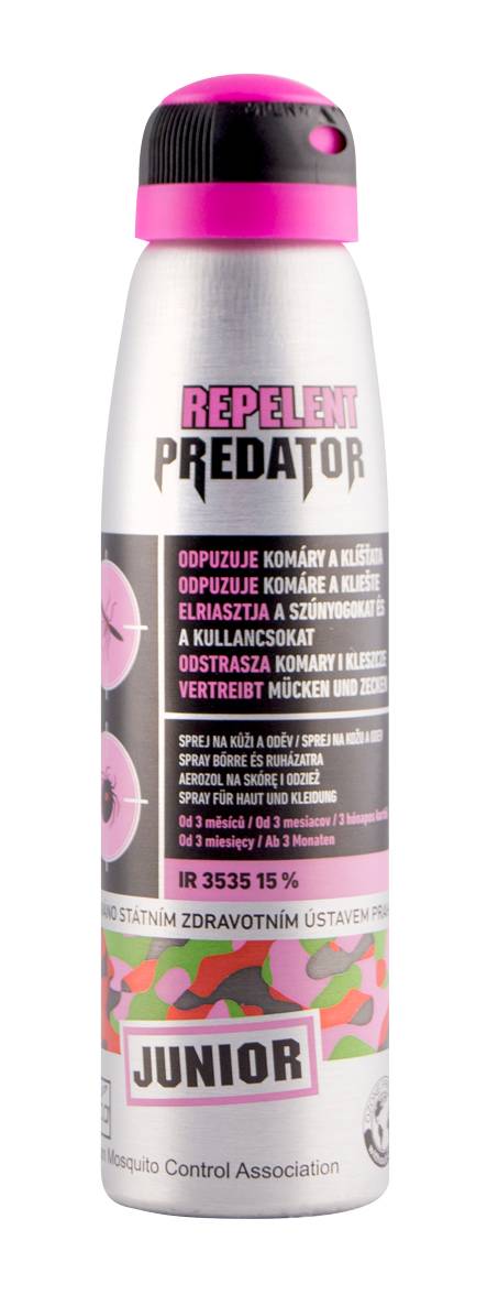 Predátor repelent Junior slouží k odpuzení komárů a klíšťat. Sprej lze použít na kůži i na oděv a jeho aplikace se doporučuje od 3. měsíce.